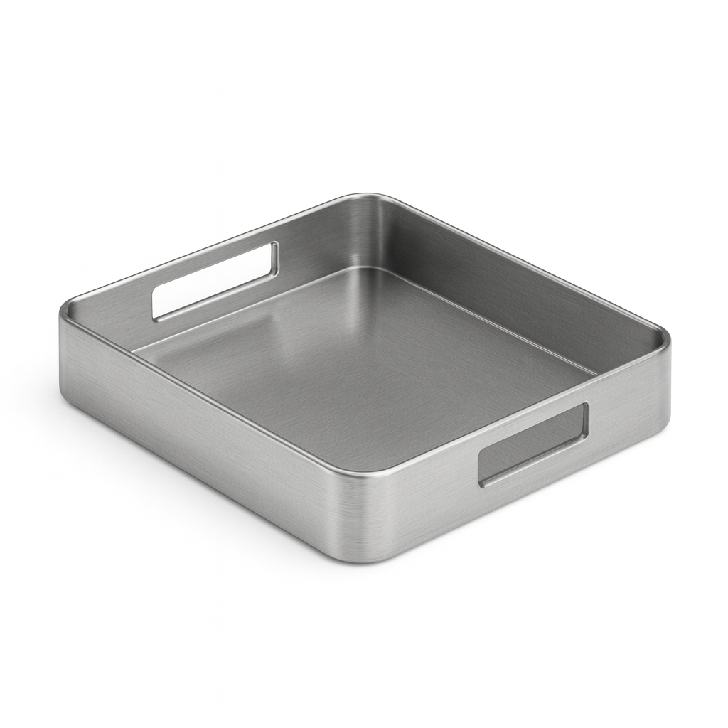 Nas especificações técnicas, a bandeja deve ser posicionada sobre superfícies estáveis e niveladas, garantindo segurança especialmente quando utilizada para apoiar itens frágeis ou decorativos. Embora não demande instalações elétricas, hidráulicas ou de gás, é fundamental consultar o site do fabricante para confirmar medidas reais, materiais, acabamentos e possíveis variações do modelo, assegurando alinhamento entre o produto físico e o modelo BIM. A manutenção deve seguir orientações adequadas ao tipo de material, preservando a durabilidade e a aparência.