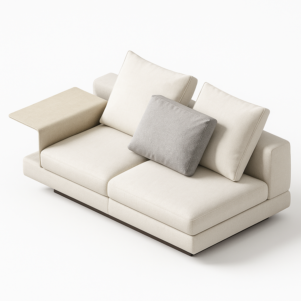 Este módulo de sofá com um braço e aba lateral integra composições de estar que valorizam conforto, alinhamento visual e flexibilidade espacial. Suas dimensões permitem configuração em linha ou combinação com outros elementos da série Connery, atendendo salas residenciais e ambientes corporativos de alto padrão. O design equilibrado facilita o posicionamento em áreas de uso contínuo, respeitando circulação e ergonomia.